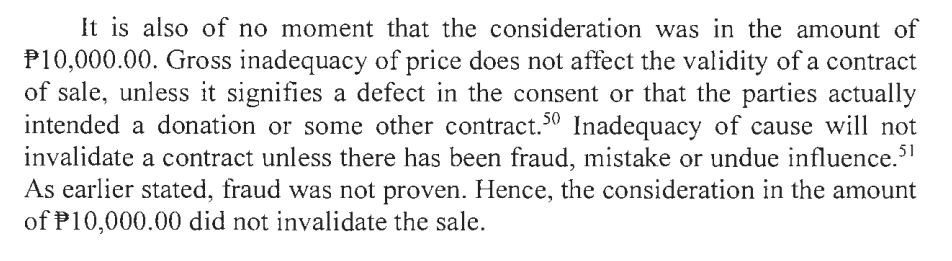 SOCORRO SAID THAT THE SALE IF THERE WAS IS VOID BECAUSE THE CONSIDERATION WAS ONLY P10,000 WHILE THE VALUE OF THE PROPERTY IS MUCH MUCH MORE. SUPREME COURT SAID GROSS INADEQUACY OF PRICE DOES NOT AFFECT THE VALIDITY OF A CONTRACT OF SALE UNLESS IT SIGNIFIES DEFECT IN CONSENT.