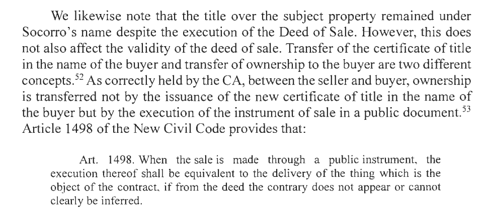 SOCORRO SAID THE SALE IS NOT VALID BECAUSE SHE KEPT THE OWNER’S COPY OF THE TITLE AND TITLE WAS NEVER TRANSFERRED TO LORNA. SUPREME COURT SAID SUCH FACT DOES NOT AFFECT THE VALIDITY OF THE SALE. TRANSFER OF TITLE IS DIFFERENT FROM TRANSFER OF OWNERSHIP.