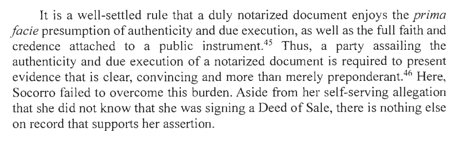 SOCORRO SAID SHE IS AN ILLITERATE AND THUS SHE DID NOT KNOW SHE WAS SIGNING A DEED OF SALE. SC SAID THAT ASIDE FROM HER SELF-SERVING ALLEGATION SHE FAILED TO PROVE THE SAME. BESIDES, THE DOCUMENT IS NOTARIZED AND THUS ENJOYS THE PRESUMPTION OF AUTHENTICITY.