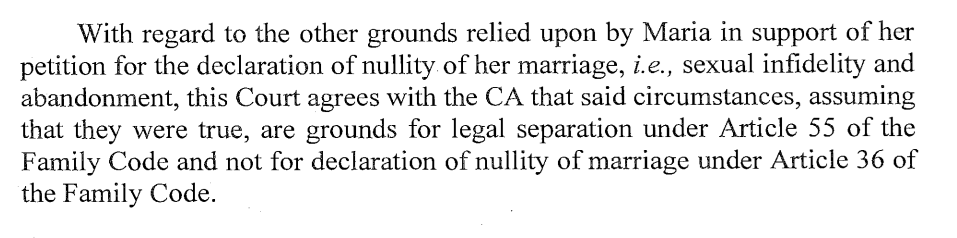 MARIA, AMONG OTHER GROUNDS, ALLEGED SEXUAL INFEDILITY AND ABANDONMENT. THERE ARE NOT SUFFICIENT GROUNDS.