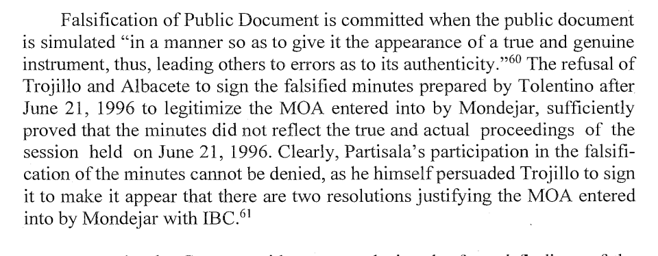 MONDEJAR FALSIFIED MINUTES OF SESSION OF SANGGUNIANG PANLALAWIGAN. AS A RESULT HE WAS ABLE TO ENTER INTO MOA WITH IBC WITH RESPECT TO THE CHANNELING OF TIGUM RIVER. THIS ALLOWED IBC TO GET SURPLUS SUPPLY OF SAND AND GRAVEL EXTRACTED FROM THE RIVER DESPITE NOT HAVING A PERMIT AND NOT PAYING FEES AND TAXES. THIS IS GROSSLY DISADVANTAGEOUS TO THE GOVT.