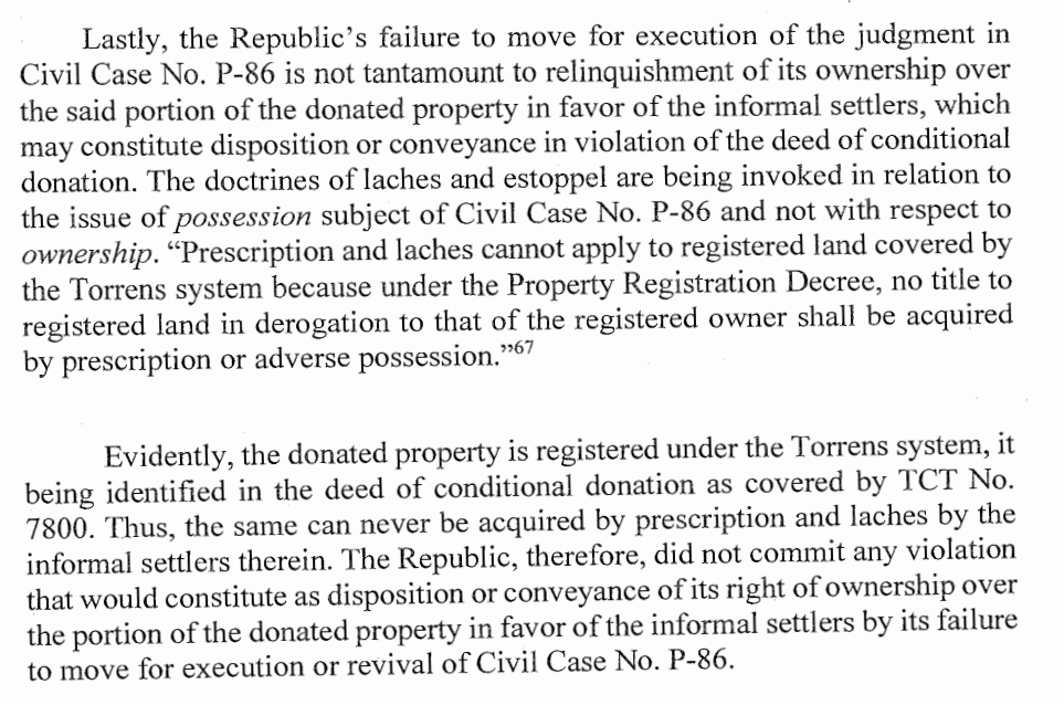 RODRIGUEZ DONATED PROPERTY TO REPUBLIC TO BE USED FOR BUILDING AND OPERATING MENTAL HOSPITAL. ONE CONDITION IS THAT THE REPUBLIC SHALL NOT CONVEY OR DISPOSE OF THE PROPERTY TO ANY OTHER PERSON. THERE WERE SQUATTERS IN THE AREA. THE REPUBLIC FILED AN EJECTMENT CASE AGAINST THE SQUATTERS BUT FAILED TO EXECUTE THE JUDGMENT WITHIN THE PERIOD ALLOWED FOR EXECUTION. IS SUCH ACT A DISPOSAL OF THE PROPERTY IN VIOLATION OF THE DEED OF DONATION. SUPREME COURT SAID NO. THE PROPERTY IS COVERED BY THE TORRENS SYSTEM AND THEREFORE IT CANNOT BE ACQUIRED BY THE SQUATTERS BY PRESCRIPTION OR ADVERSE POSSESSION.