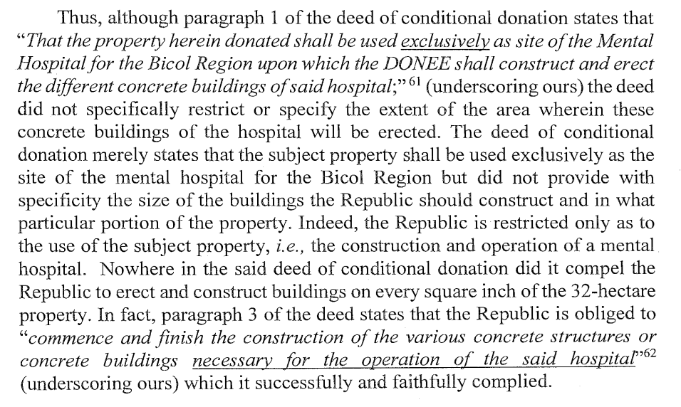 THE PROPERTY DONATED CONSISTED OF 32 HECTARES. THE AREA UTILIZED WAS ONLY 5 HECTARES. THE DEED STATES THAT DONEE ERECT BUILDINGS ON THE PROPERTY. WAS THERE VIOLATION OF THE DEED OF DONATION. NO BECAUSE THE DOES NOT REQUIRE THAT BUILDINGS BE ERECTED ON THE WHOLE AREA.