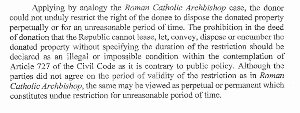 THERE IS A PROHIBITION IN THE DEED OF DONATION THAT THE REPUBLIC CANNOT LEASE, LET, CONVEY, DISPOSE OR ENCUMBER THE DONATED PROPERTY WITHOUT SPECIFYING THE DURATION OF THE RESTRICTION. IS THIS LEGAL? NO. THE PROHIBITION MAY BE VIEWED AS PERMANENT WHICH CONSTITUTES AN UNDUE RESTRICTION FOR AN UNREASONABLE PERIOD OF TIME.