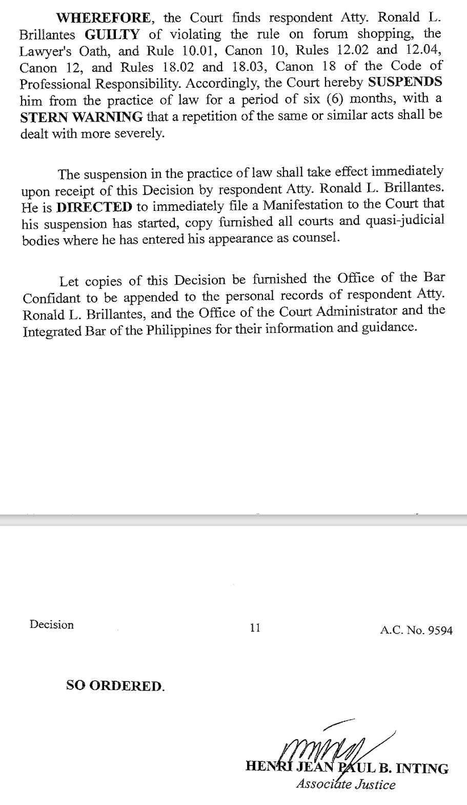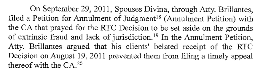 COMPLAINANTS FILED A QUIETING OF TITLE CASE AGAINST DIVINA SPOUSES. DIVINA SPOUSES FAILED TO ANSWER AND WERE DECLARED IN DEFAULT. RTC RULED IN FAVOR OF COMPLAINANTS. THE CASE WAS APPEALED TO CA AND CA AFFIRMED RTC DECISION. THE CA DECISION BECAME FINAL. THEN HERE COMES ATTY BRILLANTES AS COUNSEL OF DIVINA SPOUSES. HE FILED A CASE FOR ANNULMENT OF RTC DECISION ON GROUND THAT DIVINA SPOUSES BELATEDLY RECEIVED A COPY OF THE RTC DECISION. ATTY BRILLANTES SAID HE MERELY RELIED ON THE REPRESENTATION OF THIS CLIENT WHICH WAS NOT TRUE. AND ATTY BRILLANTES BY REVIEWING THE COURT RECORDS WOULD KNOW THAT HIS CLIENT’S REPRESENTATION WAS NOT TRUE. AND HE WAS AWARE OF WHAT WAS TRUE. HIS ACT DELAYED THE SETTLEMENT OF THE ESTATE OF REYES SPOUSES. DISBARMENT CASE WAS FILED AGAINST HIM. SUPREME COURT SAID HE BE JUST SUSPENDED FOR 6 MONTHS BECAUSE, AMONG OTHER THINGS, HE ADMITTED HIS MISDEMEANOR AND APOLOGIZED.
