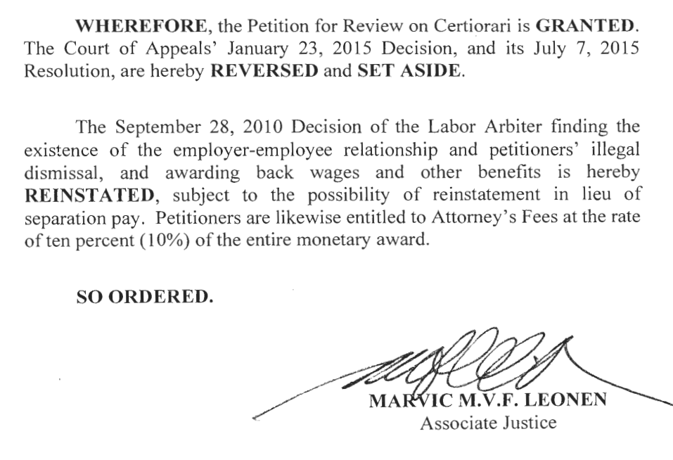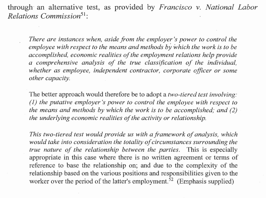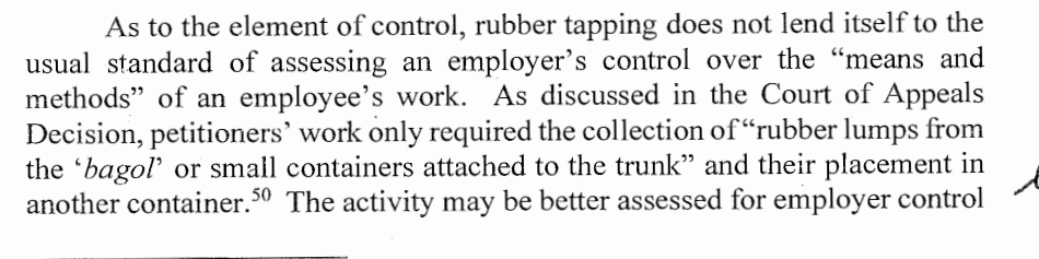 THE WORK OF PETITIONER IS JUST TO TRANSFER RUBBER LUMPS FROM THE BAGOL OR SMALL CONTAINERS ATTACHED TO THE RUBBER TREE TRUNK AND PLACE THEM IN ANOTHER CONTAINER. IT IS HARD TO DETERMINE WHETHER THE EMPLOYER HAS CONTROL OVER THE MEANS AND METHODS OF THE EMPLOYER’S WORK. SUPREME COURT SAID THERE IS AN ALTERNATIVE TEST, THE UNDERLYING ECONOMIC REALITIES TEST.
