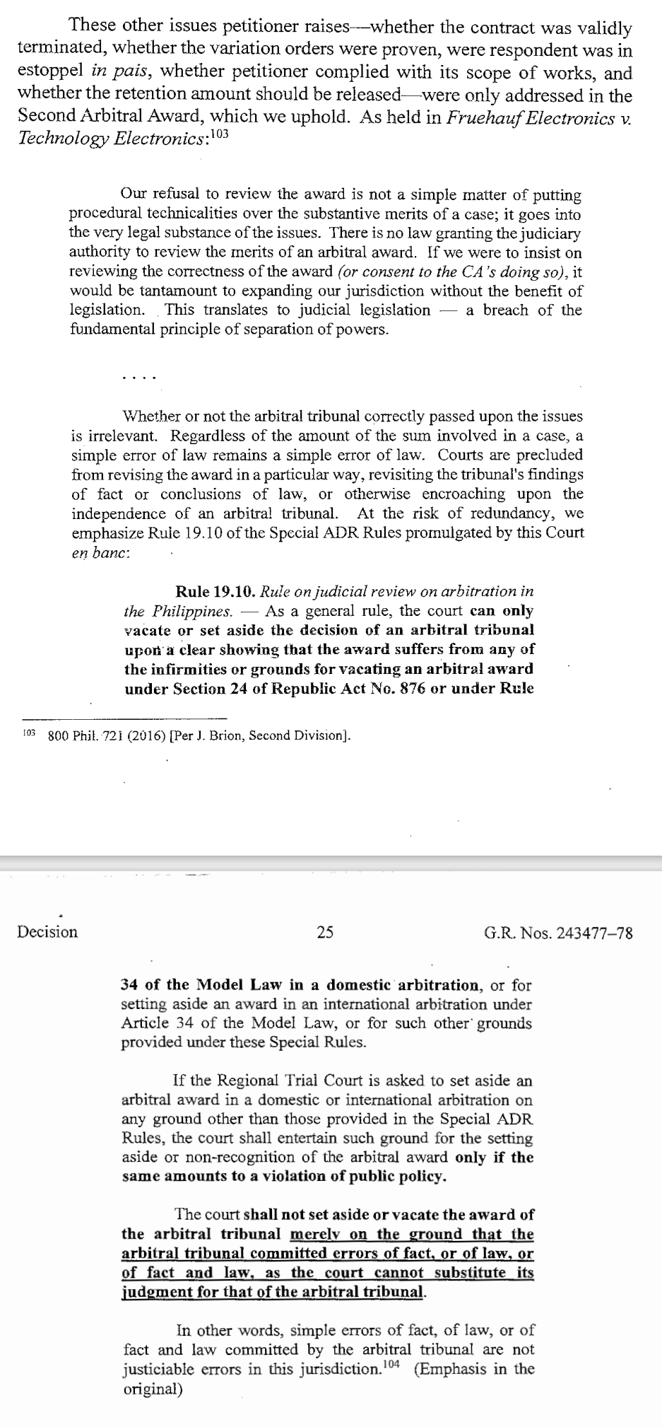 THE RULING OF THE ARBITRAL TRIBUNAL AS TO WHETHER THE CONTRACT WAS VALIDLY TERMINATED, WHETHER THE VARIATION ORDERS WERE PROVEN OR WHETHER PETITIONER COMPLIED WITH THE SCOPE OF WORKS MUST NOT BE REVIEWED BY THE COURTS. THERE IS NO LAW GRANTING THE JUDICIARY AUTHORITY TO REVIEW THE MERITS OF AN ARBITRAL AWARD.