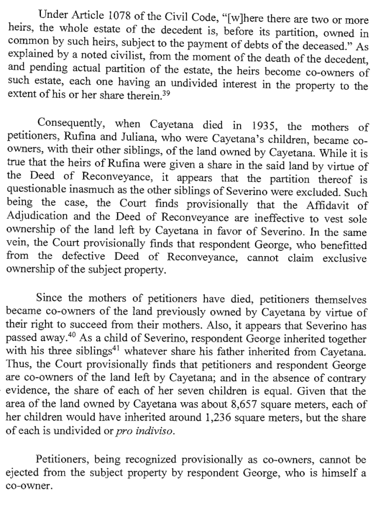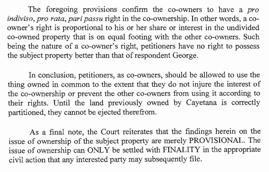 RESPONDENT GEORGE FILED A CASE FOR RECOVERY OF POSSESSION OF A LOT AGAINST PETITIONERS ON THE BASIS OF THE FACT THAT HE IS THE REGISTERED OWNER EVIDENCED BY A TORRENS TITLE. PETITIONERS CLAIM THEY ARE CO-OWNERS BY INHERITANCE. GEORGE ARGUES THAT HIS TORRENS TITLE CANNOT BE ATTACKED COLATERALLY BY PETITIONERS IN THE CASE. COURT RULED THAT PETITIONERS ARE CO-OWNERS AND CANNOT THEREFORE BE EJECTED. BUT THIS FINDING ON OWNERSHIP IS ONLY PROVISIONAL UNTIL THE SAME IS SETTLED BY PROPER ACTION.